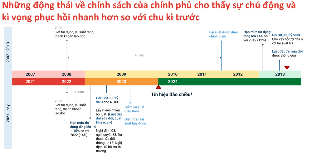 Cụ thể, khi tín dụng ngân hàng bị siết chặt vào năm 2018 thì phải đến 4 năm sau (cuối năm 2012) thì chính sách hỗ trợ thị trường mới bắt đầu được tung ra. Đơn cử như lãi suất được điều chỉnh giảm, hạn mức tín dụng tăng và gói 30.000 tỷ được ban hành,…