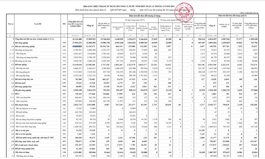 Bộ Tài nguyên và Môi trường vừa công bố Quyết định số 719/QĐ-BTNMT phê duyệt và công bố kết quả thống kê diện tích đất đai năm 2021 (tính đến ngày 31/12/2021).