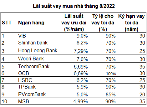 Trong đó, ngân hàng có mức lãi suất vay mua nhà thấp nhất là MSB với 4,99%/năm. Mức lãi suất này được cố định trong thời gian 3 tháng đầu với điều kiện khoản vay có thời hạn từ 24 tháng trở lên.