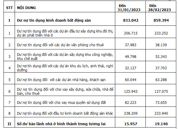 Dư nợ tín dụng đối với hoạt động kinh doanh bất động sản tính đến 28/02/2023. Đơn vị tính: tỷ đồng.